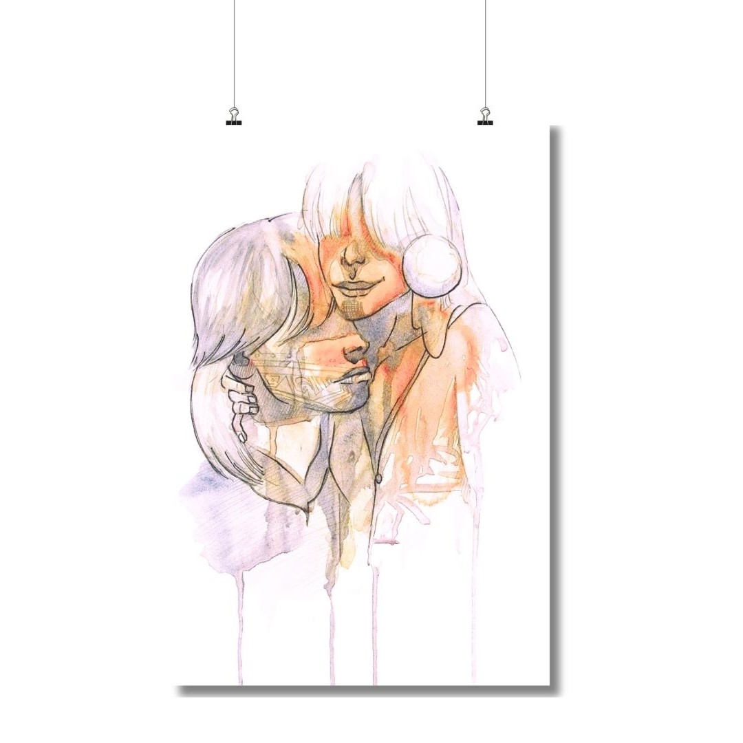 La artista nos presenta un retrato de una pareja de indígenas que se aman profundamente. con su transparencia y sus trazos delicados, nos recuerda la fragilidad y la belleza del amor. La composición, con un fondo suave y un primer plano que destaca el abrazo de la pareja, enfatiza la intensidad del momento. La paleta de colores, con predominio de tonos cálidos y terrosos, evoca la calidez y la profundidad del amor. La obra es un reconocimiento al amor en su forma más pura y un llamado a celebrar la conexión humana.